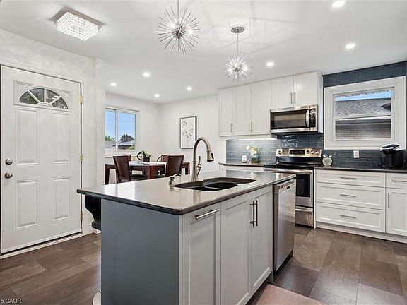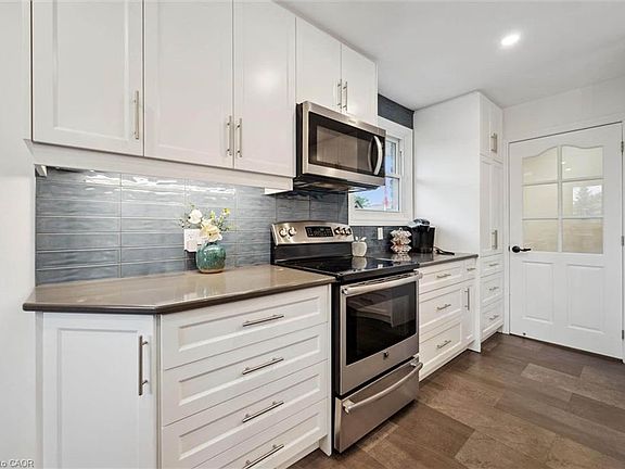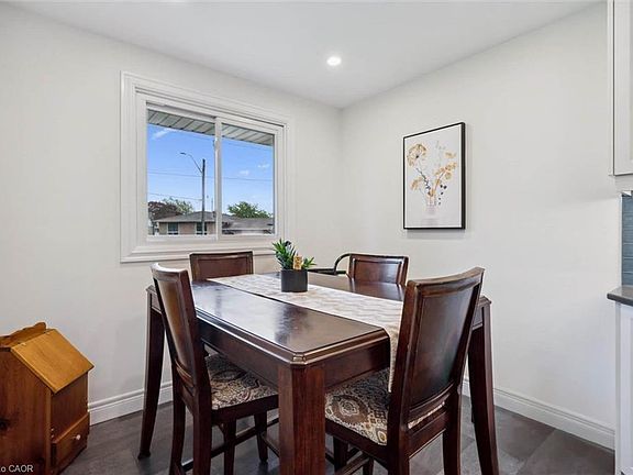 Quiet family-friendly courtCaesarstone countersSubway tile backsplashFull-height white cabinetryAdjoining dining areaNewer hardwood floorsBay window