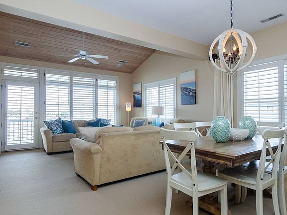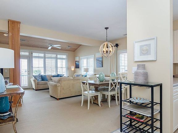 "All Decked Out" is a top floor 3-bedroom, 2-bathroom condo located at the end of Columbia Street in a quiet condo community with only four units. This third-floor property offers privacy, wonderful sound views, spectacular sunsets, and is in the center of Wrightsville Beach. Nicely decorated with a bright and airy living and dining area that opens onto a covered deck. The living room has comfortable furniture and beautiful wooden ceilings that give a modern beach feel to the space. Just off the living room is the primary suite with a king bed and a large private bath with convenient access to the sound front deck. The split floor plan offers added privacy for guests. Two guest bedrooms, one with a queen bed and the other furnished with two twin beds, are located off the main entry hall. A guest bathroom is located opposite the kitchen. The kitchen has plenty of pantry space and is easy to navigate.