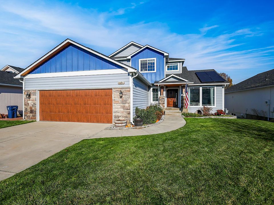 This stunning, updated 4-level home in Eagle Ridge area offers 6 bedrooms, 4 full bathrooms, and a perfect mix of comfort and style. The main level features new LVP flooring, a formal living room, and an upgraded kitchen with quartz countertops, an island with a breakfast bar, and a pantry. The cozy family room includes a gas fireplace and custom barn doors. Also on this level are a bedroom, a full bathroom, and a laundry/mudroom next to the attached 2-car garage. Upstairs, brand new carpet leads to three spacious bedrooms and two bathrooms, including the primary suite with a walk-in closet and a luxurious 5-piece ensuite. The finished basement provides extra living space with a third family room, full bath, and two large bedrooms—one of which is non-conforming and ideal for a theater or gym. Outdoors, a large 16x42 deck with a pergola overlooks the fenced backyard, perfect for relaxing or entertaining. Added features include solar panels (paid off), a hot tub, a dog run, AC, and no HOA