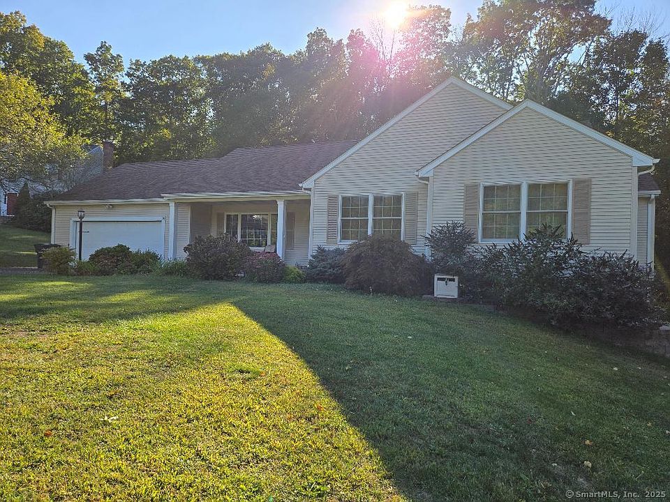 One floor living at its finest! This 3 BR, 2 BA Ranch home sits on 1.13 acres at the end of a cul-de-sac in quiet neighborhood. 2-car attached garage accesses the spacious kitchen with stainless appliances, center island w/stools and plenty of cabinetry. Dining room has HW floor, bay window and looks onto front porch entryway. Living room offers HW floor, gas-log fireplace and slider to awning-covered deck (complete with ramp) with lovely fenced-in back yard. Large primary bedroom w/full bath and walk-in closet. Enormous, clean unfinished basement with convenient walk-out (access stairway is in the garage). Newer asphalt shingle roof (2021), new boiler (2021), Renewal by Anderson windows 2022, mini-split A/C & heat systems (2024), along with other upgrades. Home also wired w/second panel to accommodate portable generator (included with home). This meticulously cared for home is a must see!