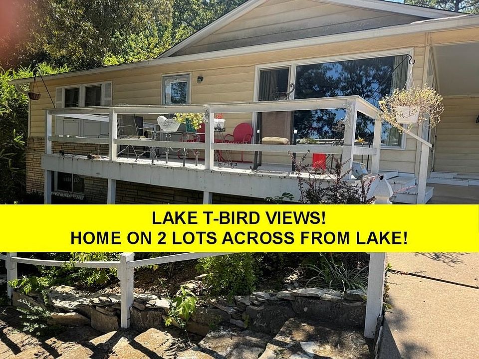 ACROSS FROM LAKE THUNDERBIRD! 2 LOTS- Over 2000 sq ft- includes Mother-in-law suite. Upstairs vintage hardwood flooring-great character! Eat-in kitchen lots of cabinets and storage. Huge living room looks out to T-Bird views thru big windows (views best fall-winter). 2 roomy bedrooms on main level-share full hall bath-laundry on main level. Large bonus room views nice patio with native stone walls. Numerous uses for bonus room - has native stone wood burning fireplace (currently has electric logs) and large storage closet- with easy access to backyard. Newer storage bldg in back. Lots of vinyl replacement windows, low maintenance steel siding. Downstairs has family room along with bedroom, 3/4 bath & lots of additional storage. Newer h/a (Elec w/propane back-up), roof, gutters, water heater-see disclosure for ages. Washer/dryer conveys at closing, new concrete septic 2012. Lot next door - great spot for garage or shop. Home is occupied requires appointment. #2417