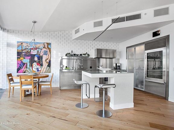 Unit 9A offers over 1,950 square feet of luxurious living with three spacious bedrooms and three and a half baths. The floor-to-ceiling windows allow for Jean Nouvels artistic vision to come to life. This moving landscape of both the Hudson River and the panoramic city skyline has three stunning exposures North, West and East. The apartment was constructed with stainless steel, etched and clear glass, terrazzo flooring and custom lighting. Jean Nouvel's total-design approach is exemplified in both the kitchens and baths of this residence. The open kitchen features Nouvel custom-designed terrazzo island with built-in mobile unit allowing for the utmost in flexibility in meal preparation, while the baths use highly engineered, sleek touch-sensitive fixtures designed by Nouvel for Jado. Set right on the Hudson River, 100 Eleventh Avenue, is conveniently located in the renowned gallery district of West Chelsea, offering 370 galleries. The 23-story tower is situated in close proximity to the newly celebrated Highline, Chelsea Cove, lively Meatpacking District, and the historic shops of Chelsea Market.