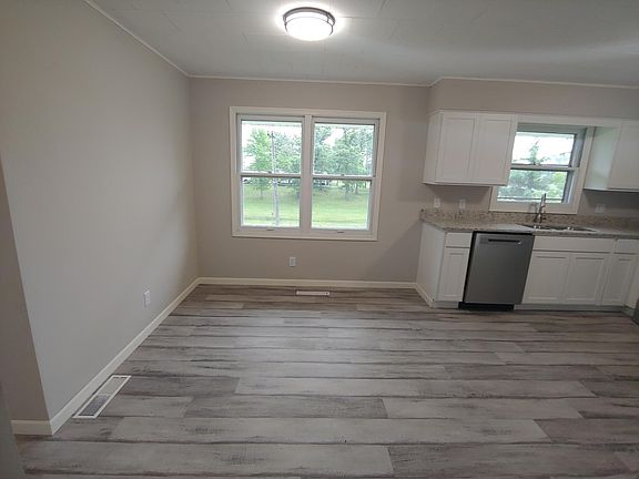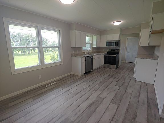 Beautifully renovated 3BR, 1BA home with all living on one level! Features include main floor laundry, attached 2-stall garage, and a backyard that opens to a peaceful campground no rear neighbors. Recent updates: new siding, overhead garage door, GFA furnace, central air, shower surround, plumbing and electrical fixtures, fresh paint, flooring, granite kitchen counters, and new cabinets in kitchen, bath, and laundry. Move-in ready with modern finishes and a park-like setting!