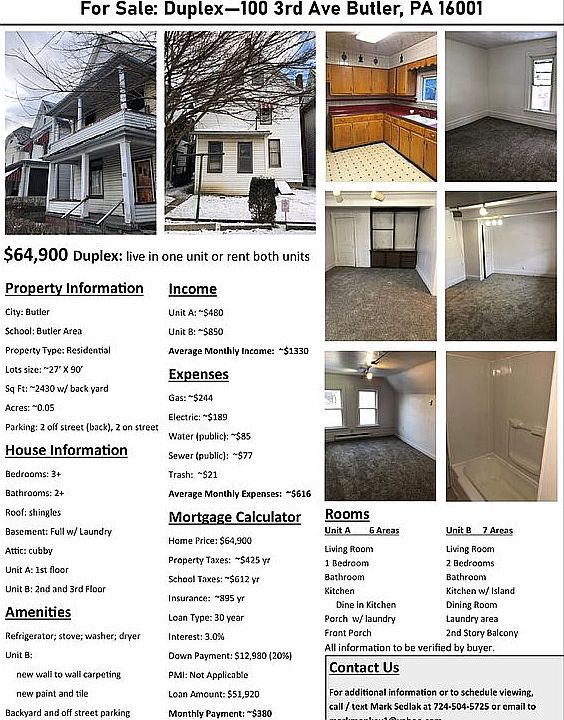 Duplex House / investment for sale by owner. 100 Third Avenue, Butler PA 2nd/3rd floors newly renovated. Ready to move in. Tenant occupied 1st floor. 2 off street parking spots Live here for free (let the rent pay your mortgage) or rent both units. 1st floor unit (1 bedroom) - living room, bathroom, bedroom, kitchen, laundry room, porch 2nd/3rd floor unit (2 or 3 bedroom) - living room, bathroom, 2 bedrooms (or 3), kitchen with island, dining room $64,900