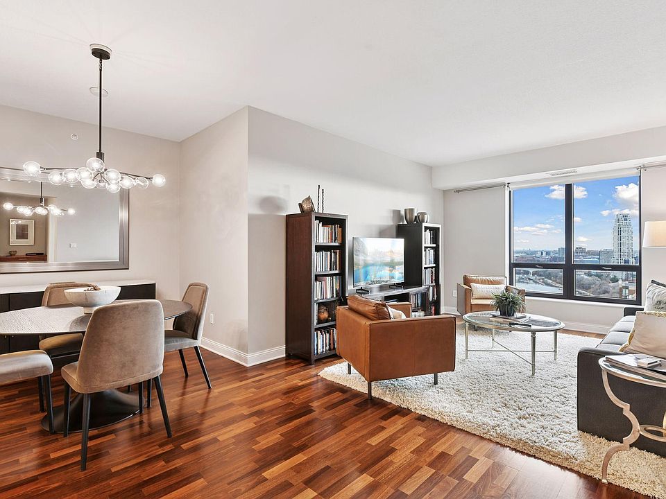 Searching for your ideal cozy city condo? Then this comfortable home on the 22nd floor of The Carlyle is simply a must see. The home features stunning city views looking out over iconic Minneapolis landmarks including the Stone Arch Bridge, Gold Medal Flour sign, and the Guthrie theater. The comfortable living room shows off those stunning views to their best advantage, and opens to the smartly laid out kitchen and dining area. The eat in kitchen with breakfast bar is great for cooking while chatting with guests and loved ones. Tucked away from the main living area is a nook with a built in desk, perfect for household management or working from home. The bedroom suite includes a spacious en suite full bathroom, and a walk-in closet with abundant storage space. The home has been beautifully cared for, with gleaming hardwood floors, fresh paint throughout, remote controlled motorized window shades, and new carpet in the bedroom. One assigned parking stall, private storage unit, and two wine lockers are included in the sale.