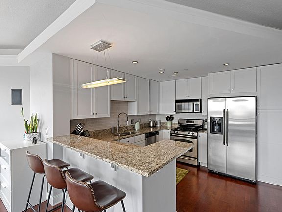 Carlyle 8th floor 1BR, 1BA, Hemingway floor plan. Features include gourmet kitchen with large breakfast bar, stainless steel appliances, granite counters, cherry cabinets, hardwood flooring throughout living space, floor to ceiling windows with panoramic views, large balcony with gas grill hook up, gas fireplace, and more! Included Enjoy top-tier amenities, including a pool, year-round hot tub, sauna, state-of-the-art fitness center, yoga room, and an inviting 5th-floor club room. The Carlyle also provides high-speed internet, cable, 24-hour front desk concierge, EV charging stations, and ample guest parking. Hosting guests is effortless with four private guest suites and 20 guest parking stalls.