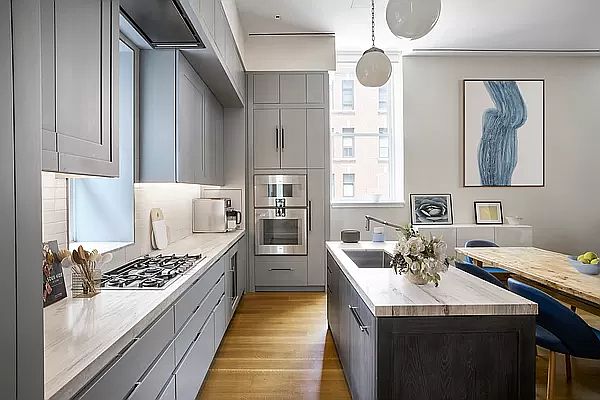 Residence 6 is appointed with exquisite finishes. The Parisian foyer with a paneled entry door is a prelude to the seamless, flowing layout with a loft-like great room. Timelessly stylish, the open chef's kitchen features custom millwork cabinetry with leather-wrapped Tanner's Craft nickel hardware. The fully integrated Gaggenau appliance package of refrigerator, freezer, five-burner gas cooktop, wall ovens, dishwasher and microwave is framed by honed Zebrino countertops with a glazed brick tile backsplash. Reflective of the distinctively detailed facade, each bathroom offers an elegant composition of materials and textures. The luxurious, five-fixture master bath, draped in Volakas honed marble, features radiant heated floors with a Bardiglio mosaic border. The teardrop chandelier illuminates the custom oak vanity and the marble-framed bathtub. The defining aesthetic element of the secondary bath is the terrazzo floor. The incandescent powder room exhibits custom marble mosaic floors and a Waterworks "Henry" vanity. All baths feature Lefroy Brooks fittings.