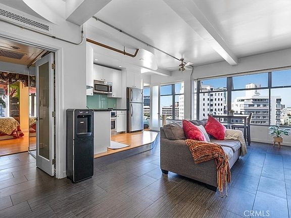 Welcome to this stylish mid-century modern condo in the heart of Downtown Long Beach! Located in the iconic Royal Palms building, this 2-bedroom, 1-bath residence offers 820 sq. ft. of thoughtfully designed living space with sweeping city views and a peek-boo view of the Queen Mary through oversized windows that flood the home with natural light. This is a end unit with only one shared wall.