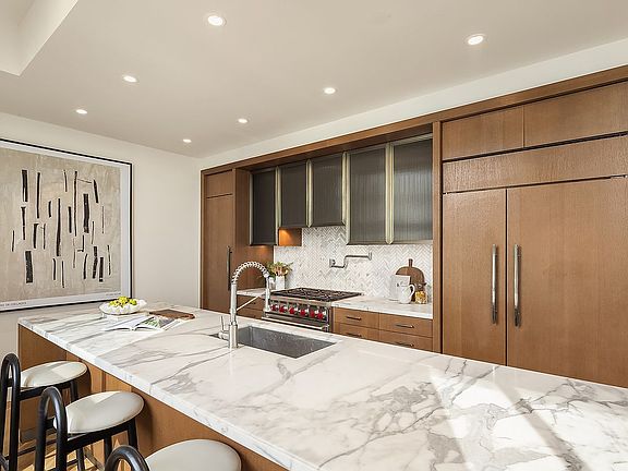 Beyond the walnut-paneled entry door, a gracious formal foyer leads into a sprawling great room stretching over 30 feet—ideal for grand-scale living and entertaining. The adjacent open kitchen is a showpiece in both form and function, featuring custom oak cabinetry with elegant brass hardware, striking Calacatta Gold marble countertops and backsplash, and a large island with seating for five. Top-of-the-line appliances by Sub-Zero, Wolf, and Miele are seamlessly integrated, along with a vented range hood, garbage disposal, and thoughtful design details throughout.