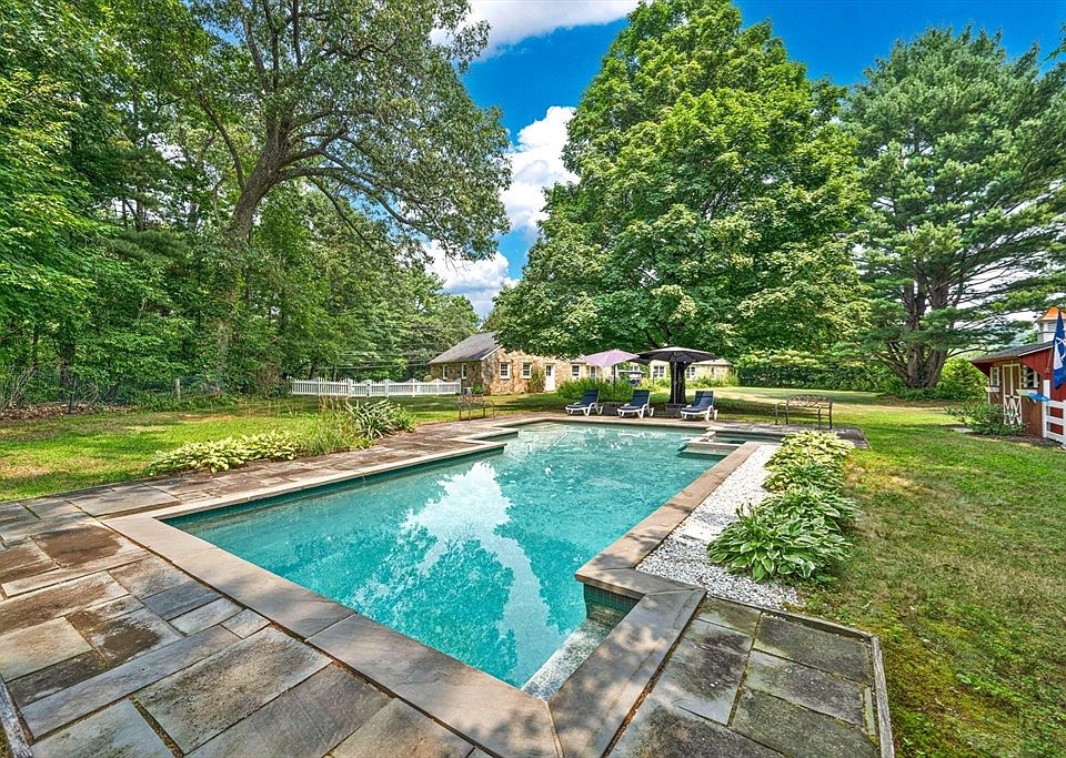 Charming French Country Ranch with Inground Pool in Picturesque Somers, CT! This thoughtfully designed 3-bedroom, 2-bath home offers a warm, functional layout centered around a stunning 15x30 great room with gas-burning fireplace. The open kitchen features granite countertops, hickory cabinets, and flows seamlessly into the dining area with slate floors and oversized windows overlooking the backyard. One wing of the home includes three bedrooms and a full bath, while the opposite wing offers a second full bath, a home office, and the flexible Nantucket room with its own fireplace: ideal as a family room, sitting area, or potential 4th bedroom. French country feel with beautiful stone exterior, newer windows, and a 2017 GAF roof with lifetime transferable warranty. The park-like grounds feature a heated gunite inground pool, hot tub, and lush professional landscaping. An oversized 30x30 two-car garage and large walk-up attic provide excellent storage. This is a must see!