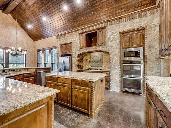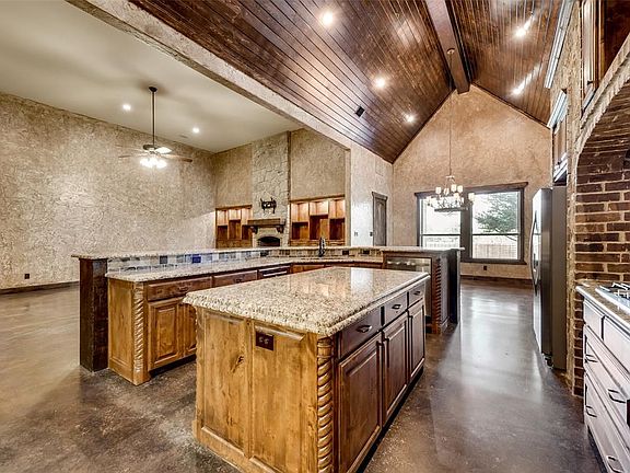 Upon entering this fabulous home, you will notice a fantastic great-room with built-ins, stone fireplace and stained concrete floors. The large kitchen has vaulted wood ceilings, granite countertops, work island, stainless steel appliances, 5 burner gas cooktop, double ovens, pot filler, butler's pantry with coffee bar and dual wine coolers.The spacious master suite features tray ceiling and abundance of windows, double shower with rain head, pebble floor, garden tub with stone surround, custom jewelry cabinet, linen storage plus a HUGE master closet with built-ins.  Also located downstairs is a study with built-ins. Outside features an enclosed outdoor living space with fireplace, perfect for entertaining