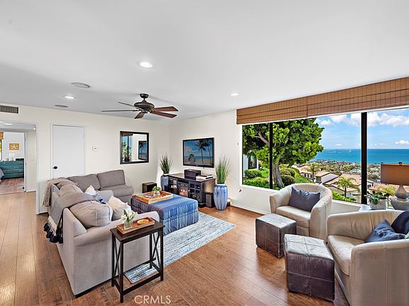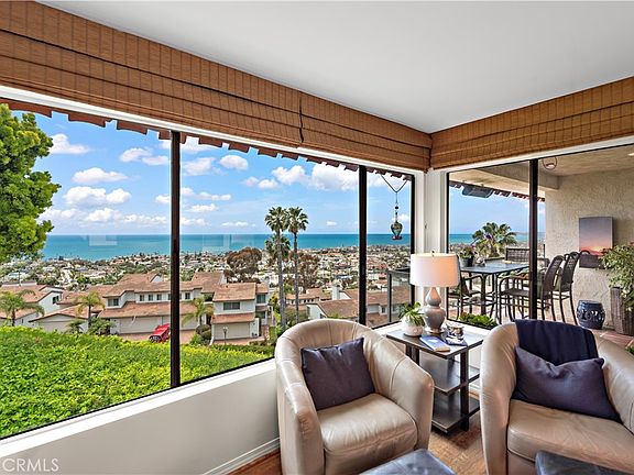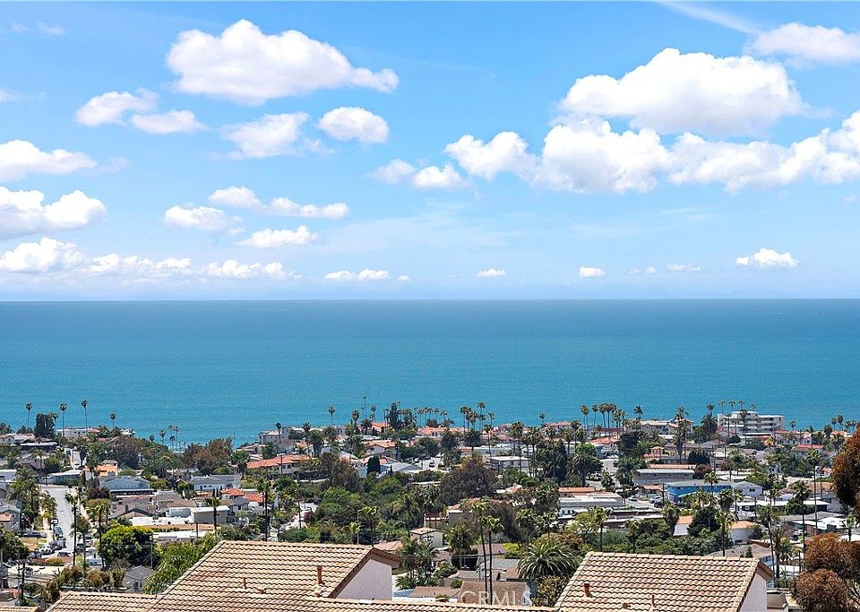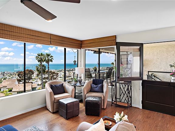 Absolutely breathtaking BIG OCEAN VIEWS from this two bedroom, two full bath home near downtown San Clemente and local beaches. Perfectly positioned to encompass INCREDIBLE ocean and Catalina views, amazing sunsets and also down to the Dana Point headlands, with beautiful city lights below you. One level living once inside, covered carpeted stairs to the front door, with a security gate at the bottom of the stairs. Unique covered front patio entry, allows you to create a true indoor outdoor living space, with the most beautiful views. Custom Dutch door entry allows wonderful ocean breezes, plus an open floor plan inside, large windows for sit down ocean views from your living and dining spaces. Kitchen is open to the dining room and family room, with freshly painted kitchen cabinets and the entire interior of the home recently painted as well. Laminate wood flooring throughout, central air conditioning which is rare to get at the beach, custom natural fiber blinds on every window, remodeled baths, built in wine refrigerator in the kitchen, full size washer/dryer conveniently located inside, a mounted heater on the patio for the Southern CA evenings, are just some of the features of this special home. The covered patio has a custom glass railing installed, plus that space could truly become an outdoor living room or dining room with comfortable outdoor furniture and a tv installed, if one desires. One car garage with overhead racks for storage, plus plenty of street parking. Can be sold furnished if desired. This home is a must see, this view is unbelievable, great location only minutes to the San Clemente beaches, downtown restaurants and shops, plus easy freeway access. Come enjoy the San Clemente lifestyle!