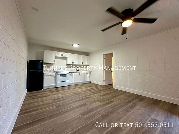 This apartment makes the most of its space with a thoughtful layout. The open living area blends the kitchen and living room, featuring wood-look flooring and white brick-style walls. The modern kitchen includes white cabinetry, a full-size refrigerator, and a range. The bedroom offers a bright, comfortable space with a large window. The bathroom has a clean, white design with a shower and tub combination. Ceiling fans and recessed lighting throughout add comfort and a warm feel. Overall, the apartment's efficient design creates a cozy and functional place to live