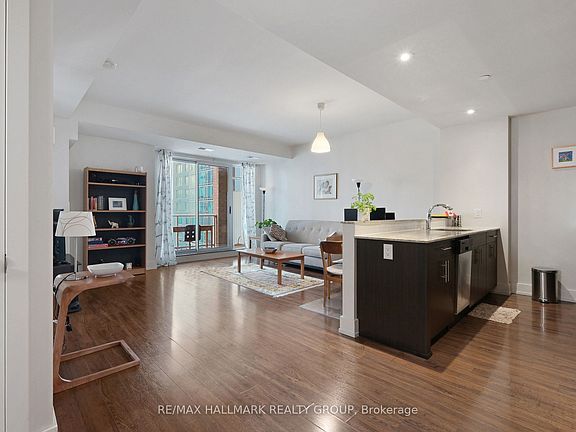 Bright, comfortable, and perfectly placed in Little Italy. Suite 706 at HOM by Domicile is a one-bedroom with real living space and an easy, city-ready routine. This unit comes with one parking spot and one storage locker. Morning light pours across the open living and dining area through large windows, while hardwood floors keep the space warm and cohesive. The kitchen is larger than most condos in this price range, with full-height cabinetry, a gas range, stone counters, tile backsplash, and an island that works for prep, coffee, and casual meals. The bedroom is quietly tucked away for restful nights, and the full bath and in-suite laundry keep day-to-day life simple. Step outside to a private balcony with open urban views that stretch across the neighbourhood.Life at HOM adds practical amenities you will actually use. Work out in the fitness room, meet friends on the outdoor terrace with barbecue stations, and book the lounge with a kitchen when you want to host. There is also secure bike storage for weekend rides.The location is the point. You are a short walk to Preston Street with cafes, bakeries, and restaurants for every mood. Dows Lake and the Rideau Canal are close for runs, paddles, skating, and festivals that mark every season. Commuting is simple without relying on a car. The Hickory Street footbridge connects you to the O-Train, with paths and bike routes all around.If your version of Ottawa living is an espresso on Preston, a loop around the lake, and an easy ride to the office, this home fits the rhythm. A bright one-bedroom with a big kitchen, natural light, large windows, hardwood floors, a balcony, and views, set in a quiet concrete building in one of the city's most loved neighbourhoods.