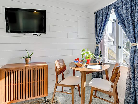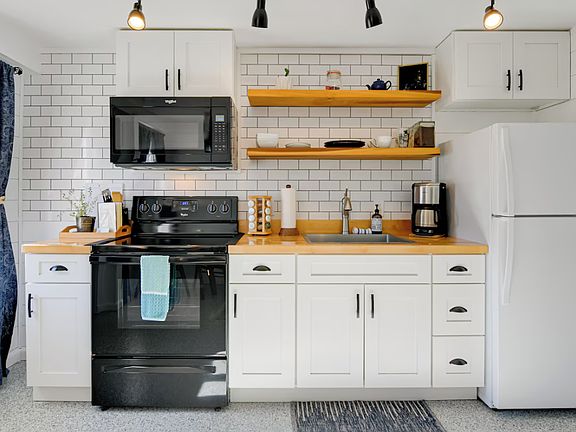This first-floor unit features a thoughtfully designed living space with full-size kitchen appliances, butcher block countertops, and a newly updated bathroom. The studio comes furnished with a double bed and a double futon sofa, dining set making it move-in ready for your stay.