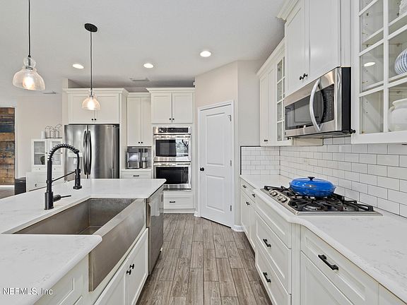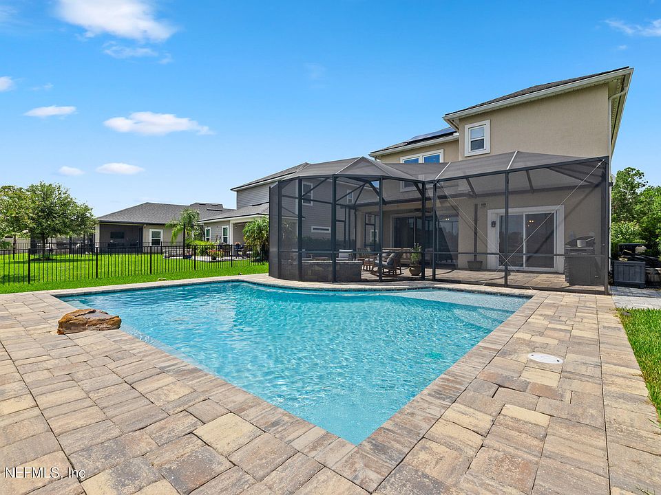 Enjoy resort-style living in this show-stopping Beacon Lake POOL home with water views, fully paid SOLAR panels & EV charging station for sustainable living & lower utility bills! You'll fall in love with the fenced backyard oasis featuring a birdcage-screened lanai with outdoor kitchen and gas fire pit! Take in spectacular sunset views while lounging by the sparkling heated, saltwater pool. From the moment you enter the 2-story foyer, you'll note the attention to detail in every room. Gourmet kitchen, beautiful wood-look tile flooring, soaring ceilings, abundant natural light, custom trim work and upgraded lighting throughout. The open & inviting living room boasts serene views & a fireplace for cozy, relaxing evenings. The kitchen is complete with a large quartz island, upgraded white cabinetry, subway tile backsplash, pantry with wooden shelves, & stainless steel farmhouse sink & appliances. Complete the first floor tour by visiting the lovely to check out the spacious loft/family room! The Spacious primary suite features a tray ceiling & lovely backyard vistas. The luxurious en suite is equipped with a stunning frameless shower & dual sink vanity. Secondary bedrooms are generously sized. Extra perks include an expanded driveway, EV charger, $43K in paid-off solar panels and security cameras. Enjoy Beacon Lake's fantastic resort-style amenities - pools, sports courts, fitness center and more. Plus an unbeatable location near shopping, dining, beaches and I-95. Zoned for NEW Lakeside Academy and Beachside High. This home truly has it all!