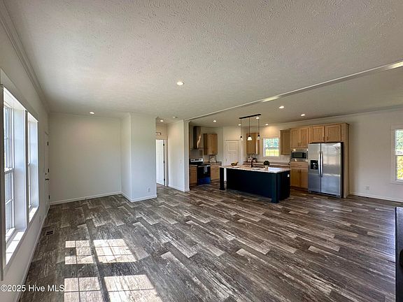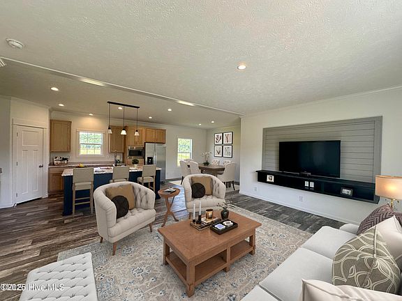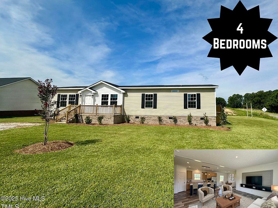 Welcome to this stunning 4 bedroom, OR use one as BONUS room~Open floor plan designed for both comfort and style~The spacious family room boasts a built-in wall entertainment center with elegant trim accent~The chef's kitchen is accented with a center island/eat at bar, pendant lighting and sleek appliances. The primary suite offers plenty of room for your furniture and has a huge walk-in closet. A spa-like luxurious bath awaits you, featuring a large separate shower, double sinks, and convenient linen closet. On the opposite side of the home you will find 3 more bedrooms OR use one as a Bonus Or Hobby room, you choose the use~A well-planned laundry room with workstation adds functionality. Outdoor living is enhanced by a welcoming front porch, separate side-entry and deck ~Welcome Home