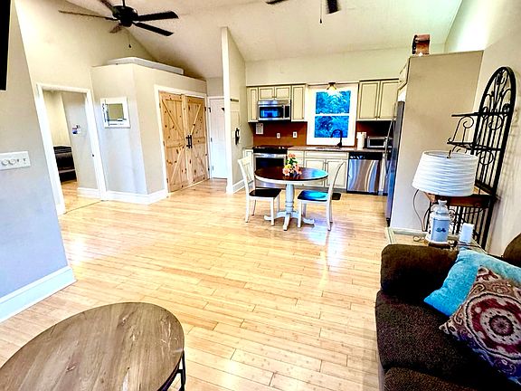 The interior boasts vaulted ceilings, sleek wood flooring, and stylish ceiling fans that enhance the airy living space. The kitchen shines with elegant quartz countertops, stainless steel appliances, and charming cabinetry, seamlessly flowing into the living and dining areas for effortless entertaining. While the rental comes mostly furnished, one bedroom is unfurnished, offering flexibility for use as a second bedroom, home office, or personal gym.