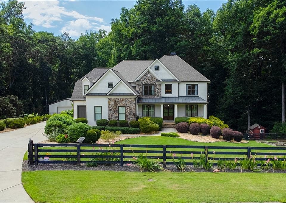 Milton Address with Cherokee County taxes and schools!! Welcome to this beautiful gated, 7 BR, 5 BA private 2+ Acre Estate featuring a traditional farmhouse with high ceilings on all three levels, saltwater heated pool, heated 30x60 outdoor building with auto roll up door and 220 amp power, fully fenced and much more!! Enjoy being surrounded by the picturesque equestrian farmland in Alpharetta/Milton while being minutes away from many of the areas favorites including the Avalon, Crabapple Square, The Mill on Etowah, and more! From the welcoming southern front porch and throughout, enjoy an updated estate with custom millwork and beautiful natural light! A two story foyer flanked by living room with glass French doors, and on the opposite side, the dining room with upgraded lighting. Walk down the hall into the large open great room with picture windows and centered by a stacked stone fireplace with custom built-in bookcases. Beautiful light oak hardwood floors throughout the main and upstairs levels, plantation shutters, barn doors, stone accents and ship-lap walls. The charming Kitchen reflects true farmhouse style featuring modern gray cabinetry, center island, beautiful quartz and custom granite countertops, tile backsplash, separate wine/coffee bar, custom shiplap vent hood, and a large walk-in pantry with barn door. The open concept breakfast area provides views to both the kitchen and great room and has access to the rear deck overlooking and leading down to the top-of-the-line heated pebble tech saltwater pool, covered patio walkout from Terrace level, and lush backyard. The home has the convenience of a bedroom and full bath on the main level. Walk up the custom staircase with steel railings and bannisters to the upper level with an expansive master suite. The Master features custom millwork, tray ceiling, custom electric window shades, a personal home office or gym, and TWO large his and her walk-in custom closets. The gorgeous spa bath offers a peaceful escape with a grand soaking tub, oversized marble and porcelain tile shower, and a separate water closet. Three additional bedrooms are also located on the second level; one bedroom with ensuite bathroom. The two additional bedrooms share an updated Jack and Jill bathroom. There is also an additional second story bonus/flex room space which is sizeable. The terrace level is fully finished featuring a home theater, game room with pool table, a full wet bar with 2 beer tap, sink, dishwasher, and icemaker, a king sized private bedroom with access to the patio, full bath, and an additional room with a closet, and large storage area. From the game room or home theater step out onto the covered patio with access to the pool area, where your family will remember enjoying great summer days and nights by the pool. The entire property is gated and fenced with two access gates (one electric), plenty of parking, custom landscaping and privacy. In addition to all updated custom interior finishes, this home offers high end efficiency. It includes a 40 panel solar system, the highest most efficient dual fuel Lennox 25 SEER HVAC systems available, a hybrid heat pump electric water heater system with an additional propane gas backup water heater, R60 insulation, variable speed pump and Wi-Fi controls for the swimming pool, 3 climate controlled attached garages. The garage floors have epoxy floor coatings, upgraded lights, New roof 2022 , interior and exterior of the home recently painted. There is also a heated 1800 sq ft garage with a 14 ft door that can house a motorhome/RV, tractor, lawn equipment, or any other motorized toys and equipment. This home offers an unmatched lifestyle for the whole family! Only minutes to great local restaurants, shopping, entertainment, Milton parks, award winning schools, Crabapple, Alpharetta, Halcyon and Avalon & GA400. This is a desirable find with the benefit of sought-after Milton, but Cherokee County taxes and schools!