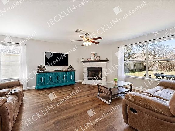 Farmhouse-styled 4 bedroom, 2 and 1/2 bath home on an oversized corner lot in sought after Hutto. Ejoy the beautiful stone exterior with large shade tree welcomes as you pull up to the two car garage. In the family room, the corner stone fireplace overlooks the bright kitchen equipped with modern cabinetry and stainless steel appliances. Upstairs are 4 bedrooms and two baths and a spacious bonus room which is great for a game room or home office. The primary bedroom offers a beautiful coffered ceiling, garden tub, separate shower and dual sinks. Enjy The large fenced in backyard offers privacy and ample space for gatherings.