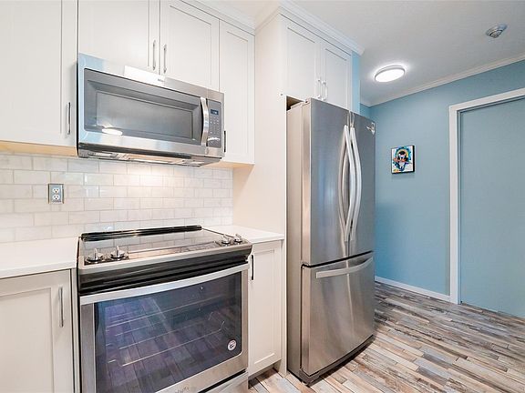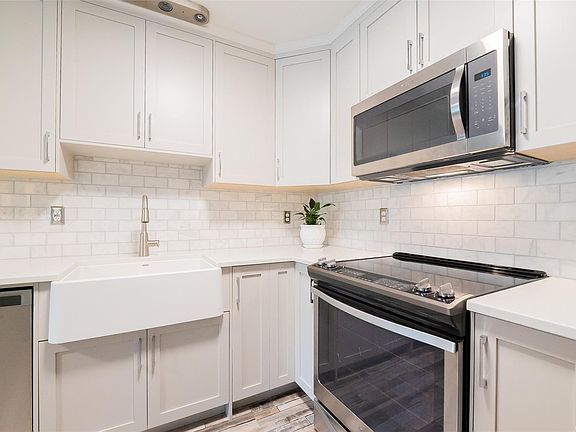 Waterfront walkwayIsland with eating barStylish backsplashFarmhouse sinkWall of built-in cabinetsSpacious bedroomFour-piece bathroom