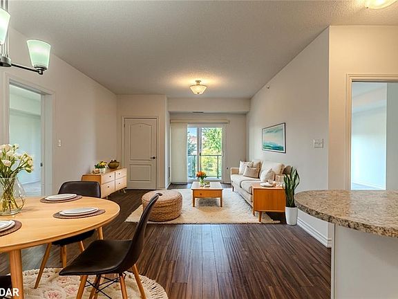 MODERN 2-BEDROOM CONDO WITH 2 PARKING SPOTS IN A DESIRABLE SOUTH BARRIE LOCATION, STEPS FROM THE GO TRAIN, PARKS, SCHOOLS & SHOPPING! Set in the desirable Painswick neighbourhood of South Barrie, this bright, clean, and spacious 1-storey condo in the sought-after Yonge Station building offers an exciting lifestyle opportunity with everything at your fingertips. Enjoy walking distance to schools, the local library, trails, Barrie South GO station, everyday shopping and dining, as well as Painswick Park with playgrounds, athletic fields, tennis and pickleball courts. The inviting open-concept kitchen, dining, and living area showcases a fresh white interior and abundant natural light, stainless steel appliances, and a sliding glass walkout to a generous covered balcony ideal for outdoor dining or peaceful morning coffees. Two comfortable bedrooms include a primary suite with a walk-in closet and private 4-piece ensuite, complemented by a second 4-piece bathroom with in-suite laundry for ultimate convenience. Added highlights include two parking spots, visitor parking, a storage locker, and access to an on-site gym facility. Don’t miss your chance to own this vibrant South Barrie condo where comfort, convenience, and lifestyle come together - your next #HomeToStay awaits!