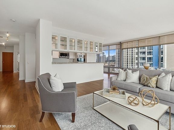 Enjoy full amenity living in this three bedroom, two bathroom condo with prime South Loop location and stunning views. Spacious living area filled with natural light from the floor to ceiling windows with stunning east and north Lake Michigan and cityscape views from every angle. Open concept layout offers a seamless flow from living to dining area with hardwood floors throughout and a private balcony. The kitchen features sleek which cabinetry with chic hardware and plenty of storage space, granite countertops with eat-in peninsula, and all stainless-steel appliances. Large primary suite with more picturesque east facing views, walk-in-closet with custom organizers, and ensuite primary bathroom with dual sink vanity, soaking tub, and glass enclosed shower. Two more spacious bedrooms also feature hardwood floors and ample closet space with custom organizers. In-unit laundry and additional storage locker included. Attached garage parking space available for $30k. Building amenities include 24-hour door staff, package receiving, penthouse swimming pool and fitness center, recreation room and more. Prime South Loop location nestled between multiple neighborhood parks, Grant Park, just step from the Lakefront Trail, Museum Campus, many shops restaurants, and entertainment with convenient access to Michigan Avenue, the Loop, public transit and expressways.