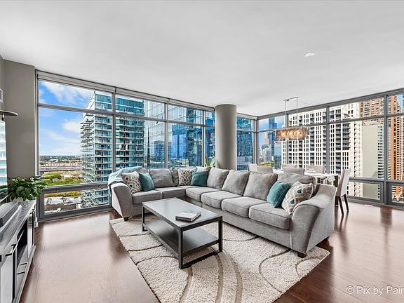 Elevate your lifestyle in this exquisite South Loop 2-bed, 2-bath + DEN condo! Craving incredible views? This corner unit showcases floor-to-ceiling windows, bathing the space in natural light and delivering jaw-dropping skyline views. The expansive, open layout is designed for seamless entertaining. The chef's kitchen features premium stainless steel appliances, an undermount sink, polished granite countertops, and a stylish breakfast bar. Rich hardwood floors flow through the living area, while the spacious primary bedroom includes a walk-in closet with custom shelving. The luxurious bath boasts a separate shower, granite-topped double vanity, and plenty of space to unwind. The second bedroom is generously sized, and there's a private balcony for enjoying city views. With in-unit laundry, custom-designed closets, and a fully equipped office space, this home has everything you need. Heated garage parking is available for $30k. The building offers top-notch amenities, including a 24-hour doorman, fitness center, pool, and party room. Located just steps from the CTA, Lake Shore Drive, Soldier Field, dog parks, grocery stores, dining, nightlife, and all the perks of South Loop living!