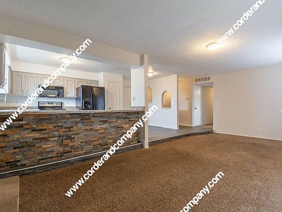 Charming 4 Bedroom, 2 Bathroom, 2 Car Garage and 1,672 Sq Ft. Home located in the Heart of Rio Rancho on a large half acre property. Kitchen includes Refrigerator, Electric Stove, Microwave and Dishwasher. Also, Washer & Dryer. Kitchen updated with new wood-look tile, ample cabinet space and new countertops. Spacious living area with new carpet and a natural stone wood burning fireplace. Large high-top bar with stacked stone accents and seating area. Primary suite with private bathroom. Three additional bedrooms with plenty of space. Enjoy the huge backyard fully fenced with access. Evaporative Cooling.