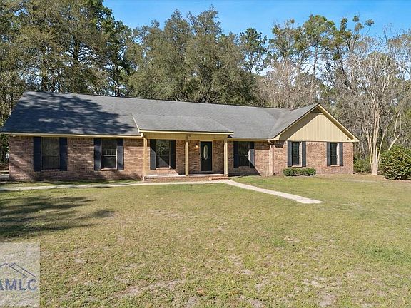 Nestled on a serene 1 Acre lot surrounded by woods, this charming Four-bedroom, 2.5 bath all brick home offers privacy and modern updates while convenient to Ft Stewart and local amenities. Step onto the inviting front porch and into the entry foyer where you will find brand new carpeting and fresh paint throughout. The home features a separate dining room with double door entry leading to the eat-in kitchen Tile Backsplash behind sink, complete with wood laminate flooring, newer refrigerator , stove, dishwasher, freshly painted cabinetry. A cozy breakfast nook with Bay window provides the perfect spot for casual dining! The spacious Living room has a brick fireplace, vault ceilings, recessed lighting and ceiling fan. Just off the living room is a screened-in-porch offering a peaceful setting overlooking the expansive back yard, and natural wooded surroundings. There is a fenced in area for pets and a storage building. Down the hallway, 4 nice sized bedrooms have ceiling fans and good size closet space.The hall bath has a long vanity, Wood Laminate flooring, and separate commode area. The master suite has a large walk in closet, an en-suite bathroom with separate commode area. Tub with Ceramic tile surround, Vanity. On the opposite side of the home there is convenient mudroom /laundry room off the kitchen with entry to the back yard. Also a half bathroom convenient for guests. Another large Great Room awaits you with double french door exit to the driveway. Perfect game room , additional living space or media room! Secluded yet close to town. Notes of interest- There is a tankless gas hot water heater, heat pump installed within the past 5 yrs, Well pump replaced within past 5 yrs- has filtration and soft water system . Irrigation system for front and back yards, If you are looking for a home not in a subdivision, no HOA, Solid all brick home nicely updated on 1 acre then Welcome Home!