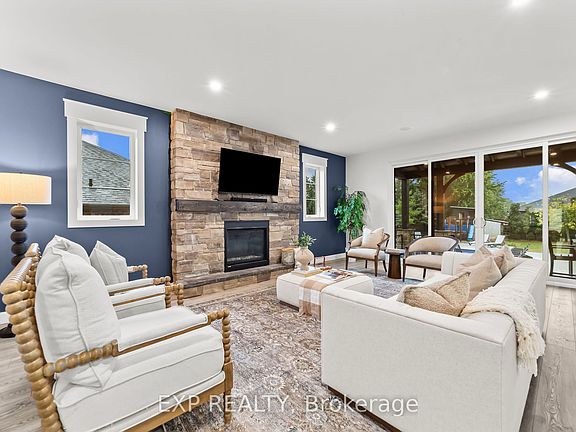 Welcome to a home where modern design meets small-town living, built just five years ago by Marvel Stone & Masonry. This stone-and-brick masterpiece was crafted with every detail in mind from its timeless curb appeal to the wrap-around porch that sets the tone for peace, comfort, and connection. Inside, the main floor blends elegance and functionality. A bright, spacious kitchen with walk-in pantry is perfect for family gatherings, while the family room with fireplace offers a cozy retreat. A large office or bedroom with countryside views provides the ideal workspace, and built-in speakers add a touch of everyday luxury. Upstairs, you'll find four additional bedrooms that are thoughtfully placed on the same level, including a luxurious primary suite with spa-inspired ensuite, his-and-hers sinks, and a deep soaker tub. The three additional bedrooms feature oversized closets, built-ins, and window benches, while the second-floor laundry room makes daily routines effortless.The lower level is designed for entertainment and function, complete with a movie theatre, gym, games area, childrens recreation space, full bath, and a 16-foot cold cellar.Step outside to your private backyard oasis: an in-ground pool, stone patios, BBQ area, water feature, built-in play equipment, playhouse, and garden boxes all surrounded by mature trees and low-maintenance landscaping. Evenings on the porch or nights by the fire create a lifestyle thats hard to leave behind.Practical features include: an oversized three-car garage with car-lift wiring, parking for six, fully fenced yard, tinted windows throughout the home, spray foam insulation, professional-grade security cameras, drainage system, sump pump with battery backup, central vacuum, and Metal Roof with a transferable warranty. Future-ready upgrades are already in place, including wiring for a hot tub, gas generator switch, BBQ hookup, and fireplace supports on the pool patio.