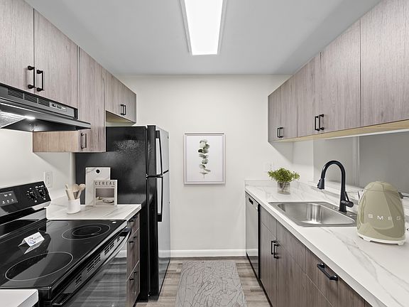 Natural wooded settingSleek new cabinetryWood look plank flooring