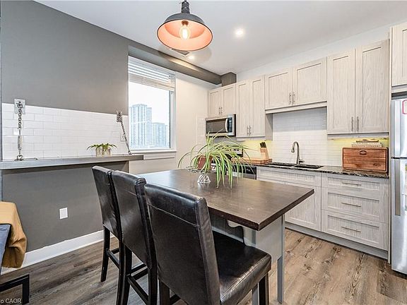 Fantastic opportunity to own this modern 1 bed, 1 bath unit in the highly sought after Garment Street Lofts in prime DTK location! This 625 sf unit features 1 underground parking space, bright and spacious open concept layout, generous eat-in kitchen space, living room with walkout to balcony overlooking the rooftop patio and extra space for storage room or small office area. Several custom upgrades have been completed including modern lighting, breakfast bar, custom reclaimed wood/steel shelving, subway tile back splash and new flooring, stainless steel appliances, quartz countertops, modern cabinetry, and more. AAA location just steps to parks, LRT, restaurants, shopping and all that Downtown Kitchener has to offer. Available for immediate possession.