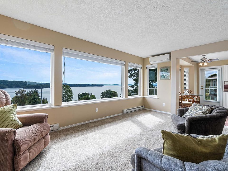 Check out this well cared for top floor, 2 bed, 2 bath, 1538 sqft bright and sunny condo with stunning ocean views! The spacious floor plan includes 2 large bedrooms including a primary with ensuite and walk in closet, huge living/dining area with gas fireplace, functional kitchen and cozy eating nook, in suite laundry, office mezzanine and tons of storage, including an additional storage locker. All the living is on the one main level. Interior stairs allow you to maximize the view and be on the top floor. If mobility is an issue, this place includes a chair lift for full accessibility. Watch the sunrise, boats sail past and whales swimming in harbour from the kitchen, living room and front deck or unwind with the evening sun on the back deck. The Lookout is a desirable place to live with a well run strata, beautiful gardens, easy walk into town and close to the ocean. Pets (1 cat or 1 dog no size restriction), rentals and all ages welcome (see bylaws).