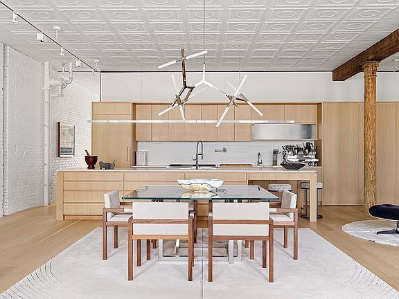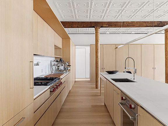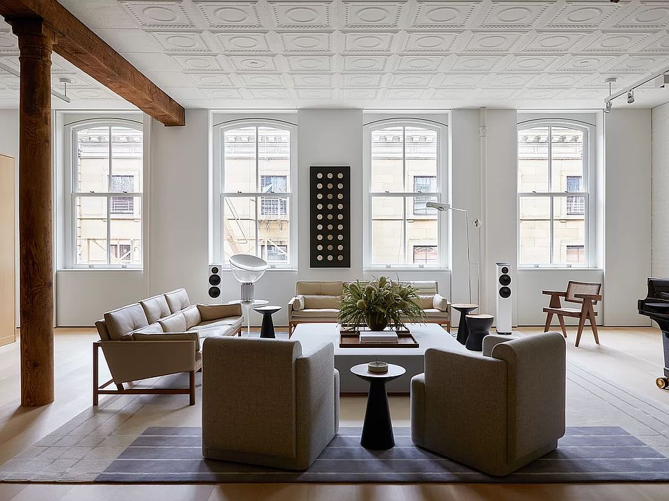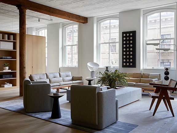 The extraordinary creation of the celebrated architect Andrew Berman and the interior designer Justin Charette, Loft 4 at 100 Grand Street is a perfect example of the integration of the prewar cast iron architecture and the modern New York loft lifestyle. All the design elements of this grand-scaled 2,800sf home cohere to create a zen refuge from the din of the city life below. The open plan provides a fluid circulation between the various environments of the space, and yet, all private quarters retain their independence from the impressive great room which measures nearly 1,300sf. Adjoining this room is the beautiful kitchen with its wall of integrated custom cabinetry, marble countertops & backsplash, a suite of top-of-the-line appliances, and the enormous island and its extended dining bar. The open loft is ringed by discrete spaces requiring privacy or utility. Just off the private elevator entry, two hallways with exquisite millwork lead one to the bedroom suites at the opposing ends of the floor plan. The primary suite features a sumptuous bathroom clad in marble and outfitted with Waterworks fixtures, and is complete with a glass-walled shower and a deep soaking tub. The loft retains some of its exquisite original details, including the wood columns, brick walls, and pressed tin ceilings. Wide-plank white oak floors complete the perfect balance of materials and elements of the stylish space. The home is also outfitted with a sophisticated Lutron lighting & shade system. Located in the heart of SoHo with a superb variety of restaurants and cafes, world-class shopping, and all major transportation is within moments of your front door. Please note there is an upcoming assessment for an estimated total amount of ~$27K for facade repairs.
