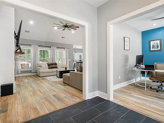 Come see this beautifully designed custom home located in the desirable Hidden Lake subdivision of Anderson. Built in 2023, it's situated on an interior lot of Lake Hartwell, With 3 landings nearby, you’re close to launching your boat! Located on a corner lot surrounded by trees and nature, you almost feel secluded while yet being in a neighborhood. This thoughtfully crafted 3 bedroom main level, 2-bath home includes a dedicated office, a versatile flex room (located upstairs and could be 4th bedroom), laundry and an oversized 3-car garage, 24 feet deep and pre-wired for two electric vehicles. Throughout you will notice extras from wide floor molding, Certain Teed Architectural 40 yr shingles to a Navien tankless gas water heater and ethernet ports in every room. Step inside to an inviting open-concept layout centered around a massive 4' x 8' island thats perfect for entertaining. The kitchen is a cook's dream featuring shaker style 42” soft-close cabinetry, granite countertops, a smooth cooktop range, built-in microwave, deep double-bowl sink, and a spacious walk-in pantry. Vaulted ceiling and luxury vinyl plank flooring throughout much of the home enhance both style and functionality. The main-level primary suite offers a spa-like retreat, complete with a luxurious 75-gallon soaking tub and exceptional closet space with custom organization. You’ll also appreciate touches like 3-panel doors throughout and generous storage space. Enjoy morning coffee or evening relaxation on your choice of two extra large, covered porches, both front and back. The rear porch is generously sized and can be easily screened in. The lot features new sod, mulch and a generous area of concrete for extra parking. Don't miss your chance to own this one-of-a-kind home that blends modern convenience with custom quality just moments from Lake Hartwell!