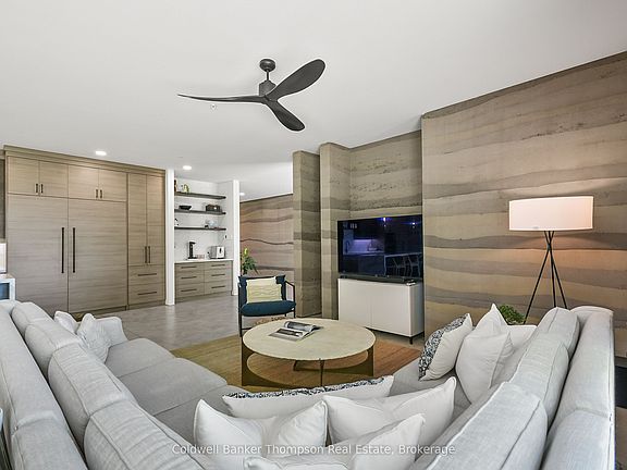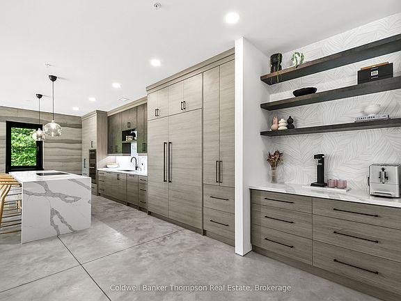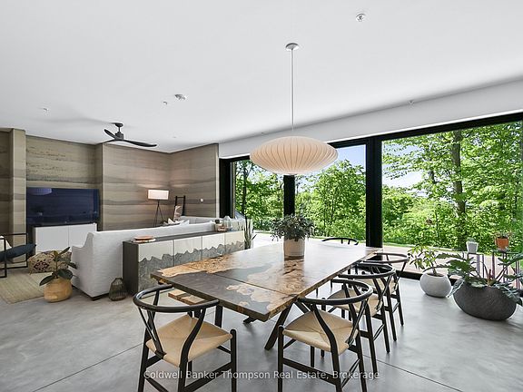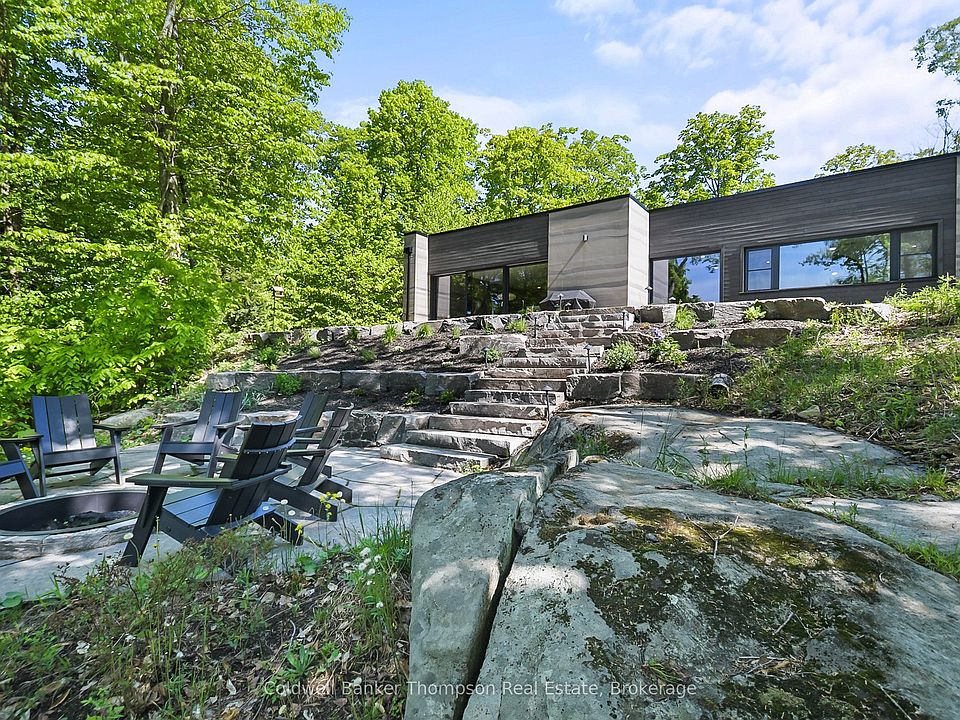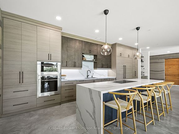 Designed to embrace the breathtaking panoramic views of Mary Lake, this exceptional almost 4 acre Gryffin Bluffs property seamlessly blends contemporary comfort with a private, immersive natural experience. Built in 2021 with sustainability and performance in mind, this 2826sq ft large 3-bedroom executive bungalow features extraordinary 29" thick rammed earth walls-- an innovative yet ancient building technique that enhances durability and offers unparalleled energy efficiency. The main living area features open-concept design with spacious living and dining space and an impressive 20x6 window wall with sliding door leading to a generous deck with a-la-mode retractable screens. The chef's kitchen is both stylish and functional, boasting 10' island with waterfall edge, top of the line appliancesoversized Subzero refrigerator and freezer, Wolf induction range and convection M series wall oven. An expansive 32' x 32' two-car garage, connected via a covered breezeway, provides ample space for storage and all the outdoor gear needed to explore the surrounding, coveted Gryffin Bluffs community. Garage is wired with a 240 volt plug that is ready to add your specific EV charging station and property is back-up powered by a 22,000kv generator that will run the home seamlessly for 5-7 days. Thoughtful hardscaping highlights the natural beauty with granite entrance, armour stone and river rock gardens, granite patio with infinity edge fireplace overlooking the expansive views enhanced by automated irrigation systems, and custom landscape lighting. Enjoy access to a shared waterfront pavilion, docks, and over 100 acres of forest trails perfect for nature enthusiasts who appreciate sleek, modern living.