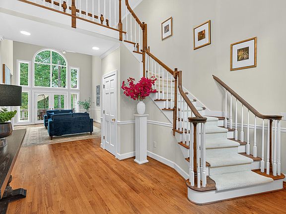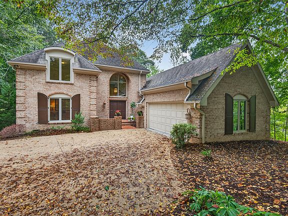 Welcome to this beautifully crafted, all-brick Goforth home—a private, dappled retreat nestled in the trees, just minutes from downtown Chapel Hill. Perched in a serene, wooded setting that evokes the feel of a mountain getaway, this home offers the best of both worlds: peaceful natural beauty yet minutes from downtown Chapel Hill. You can also enjoy a morning walk down to Café Driade! The driveway is framed by mature crape myrtles and there is ample parking adjacent to the garage. Inside, the layout is thoughtfully designed for easy main-floor living. The spacious primary suite, dedicated study, sunroom, and laundry are all located on the first floor. A gracious foyer welcomes you with a sweeping staircase that leads to two additional bedrooms and a full bath upstairs, offering privacy for guests or family. The living room is a showstopper, with soaring ceilings and dramatic windows that invite the outdoors in. Anchored by a handsome masonry fireplace and custom built-ins, the space also features a convenient wet bar tucked around the corner. French doors open onto a recently rebuilt deck and is accessible from both the living room and sunroom. The dedicated study, with grass cloth wallpaper, is a quiet and inspiring space—ideal for remote work, a music room, or a media/game room. It includes a walk-in closet with built-in shelving for games, AV equipment, or extra storage. The eat-in kitchen has abundant cabinetry including triple-door pantries, generous counter space, and stainless-steel appliances (all included). The double oven range accommodates everything from a casual meal to a holiday feast. Off the kitchen with entrance from the garage, the laundry/mudroom offers a practical drop zone with a utility sink and additional closets—washer and dryer convey. Out back, the private, deer-fenced yard is a botanical delight with mature azaleas that burst into color each spring. This inviting, well-maintained home offers a rare blend of natural tranquility and town convenience. Come experience the warmth, charm, and effortless livability for yourself!