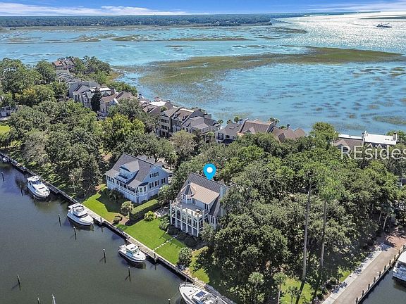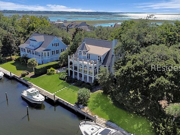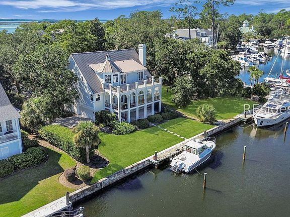 This exceptional Lowcountry home in Windmill Harbour offers an unparalleled waterfront lifestyle with a private dock right in your backyard and just minutes to the Intracoastal Waterway through the community's famed lock system. The residence exudes timeless southern charm, nestled among mature oaks and featuring a sweeping front porch, classic columns, and a raised seam metal roof that combines beauty with durable, low-maintenance living. The inside is as inviting with hardwood floors, soaring ceilings, and endless windows to enjoy the waterfront lifestyle from inside your home. Upon walking through the front door, you will be greeted with a dramatic, two-story foyer leading to a light-filled living room with a striking wall of windows, gas fireplace, and custom built-ins. The spacious kitchen has been remodeled and offers premium appliances including a subzero refrigerator and wine cooler, a dining nook overlooking the backyard and dock, and a huge walk-in pantry. To enjoy the waterfront, sit in the sun-soaked Carolina room that frames panoramic harbour vistas from every angle. For entertainers, there is a banquet sized dining room ready to host your friends and family for special holiday gatherings. The first floor is completed with a generously sized ensuite guest room with a thoughtfully designed bath and a large closet. The expansive second-level primary suite is a true retreat, opening onto a large balcony with sweeping harbour views where you can watch the impressive watercraft glide by. The recently renovated bath provides spa-like luxury and two walk in closets. Two additional bedrooms offer flexibility for family, guests or an in-home office. Extras include a three-stop elevator with convenient access to all floors, an oversized garage, woodworking shop, and abundance storage throughout. From the 70 foot private dock on the property to the enchanting Lowcountry style, this home is a must-see! Windmill Harbour is a gated, harbour-oriented community known for Charleston-inspired architecture, a world-class marina, and a vibrant social calendar should you choose to join the South Carolina Yacht Club, located on the harbour. Experience private coastal living, community pool, dog park, and round-the-clock security in one of Hilton Head Island's most coveted neighborhoods. This property perfectly blends luxury, function, and location-a rare harbour front offering ready to welcome you home.