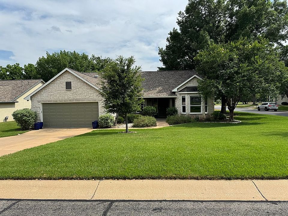 Trinity Plan [most popular] in Sun City, 2/2 w/office, gas FP, 1915 sq ft on large corner lot with all new Pella windows w/hidden screens (2024), honeycomb blinds (all windows), fresh exterior paint (2024), 10 ft ceilings, vinyl wood flooring throughout, lg master & master bath and large walk-in master closet, granite kitchen counters, gas range/oven/WH, extended utility room, 2 car garage + golf cart spot, enclosed back porch glass or screens, outside large stone patio, mature trees, full irrigation, new water softener (2024). Sun City 55+ active lifestyle community with 4 amenity centers w/ workout & pools, 3 golf courses, dedicated space for fabric/fiber, painting, woodworking, pottery, stain glass, raised gardening, and many clubs/social activities.