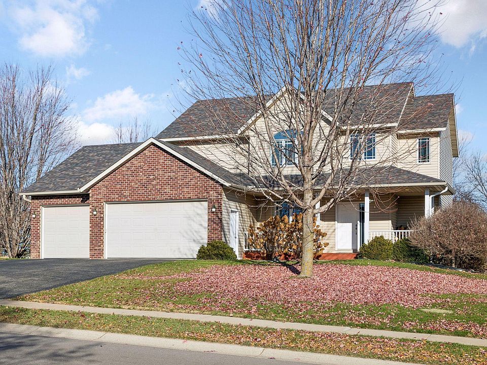 Beautiful and peaceful two-story walkout home on a large corner lot that backs up to open farmland, offering exceptional privacy and the feel of country living with the convenience of being in town. This well-maintained property features a large custom stone patio, perfect for entertaining or relaxing outdoors. Inside, abundant natural light fills every room through stunning windows. The remodeled kitchen is designed for both functionality and style, ideal for gatherings. The living room features a new stone fireplace, creating a warm and inviting atmosphere. The upper-level loft features custom built-in bookshelves for a cozy reading nook feel. The primary suite includes dual walk-in closets for added convenience. The heated, three stall garage is extra deep for all your toys. This lovingly cared-for home combines comfort, space, and charm — an exceptional opportunity that won’t last long.