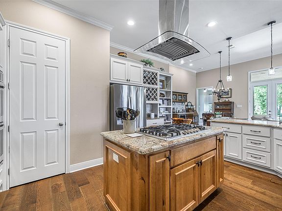 The open living area includes a chef’s kitchen, bar, dining space, and cozy den with a gas log fireplace. A home office is located off the main living area. The master bedroom features a spacious ensuite and walk-in closet, while a guest bedroom down the hall also includes an ensuite. A private third bedroom above the garage has its own ensuite and a balcony with views of La Grange.