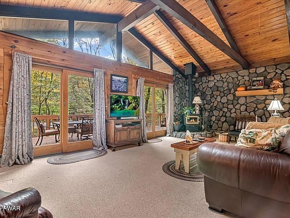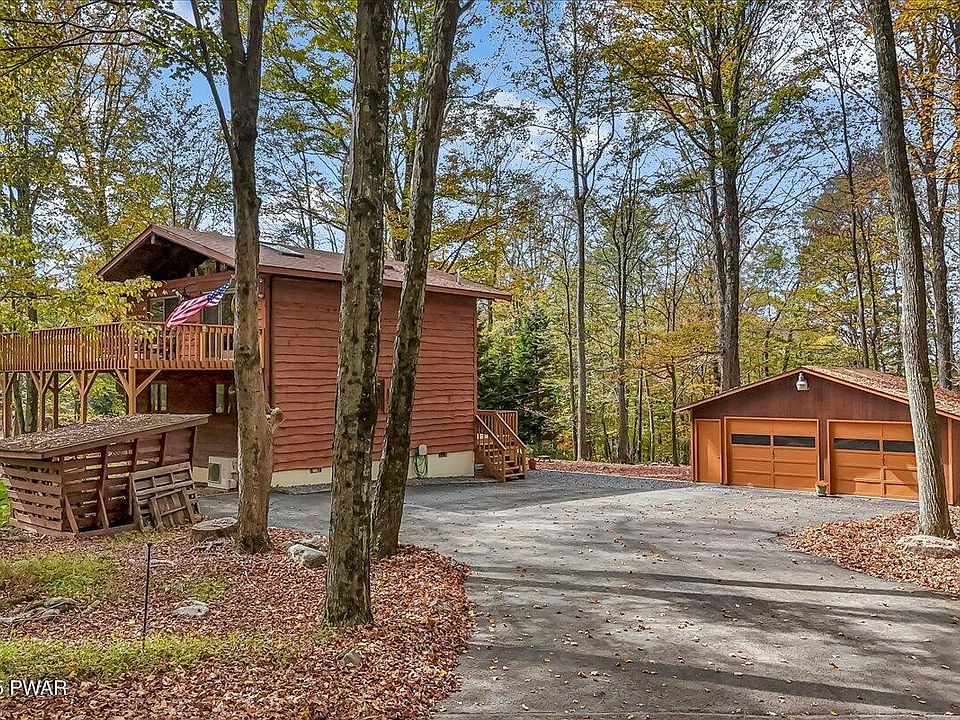 Welcome to this beautifully maintained mountain-style home in the sought-after Tanglwood Lakes community at Lake Wallenpaupack.This 3-bedroom, 2-bath home offers an elevated open-concept living space with stunning cathedral tongue-and-groove ceilings, skylights, and a cozy woodstove on a custom stone hearth. The upper level features the main living, dining, and kitchen areas nestled among the treetops, along with a full bath with ceramic tile floors and a shower.The main level includes a welcoming stone foyer, all three bedrooms, and a beautifully renovated full bath with a modern walk-in shower. One of the bedrooms also features a convenient stackable washer and dryer tucked into the closet.Outside, enjoy a level corner lot surrounded by trees, multi-level wraparound decking, a firepit area, and a paved driveway leading to a detached 2-car garage. A new roof and exterior chimney (2023) add peace of mind and value.As a homeowner in Tanglwood Lakes, you'll enjoy Lake Wallenpaupack access with boat slips, sandy beach, gazebo, and picnic area--plus access to Lake Tanglwood for paddleboarding, kayaking, and fishing. Additional community amenities include a golf course, tennis and basketball courts, playground, and a scenic nature trail.This home is move-in ready, well cared for, and perfectly positioned to enjoy ''All the Lakes, All the Time'' in the Northern Poconos.
