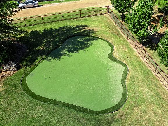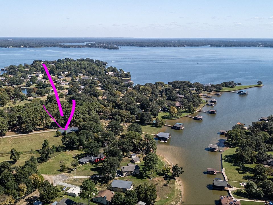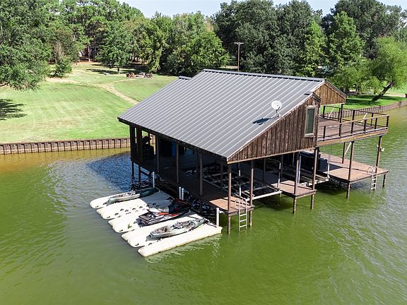 Waterfront 4 + Acre tract with so many possibilities! This tract runs along the shoreline of a deep water cove on the South end of the lake. Currently used as a family weekend retreat complete with an 1848 sq ft ultra rustic lodge style home, barn metal ceilings, reclaimed wooden floors, antler chandelier, island kitchen includes farm house apron style sink, bar seating, stone countertops, gas cooktop, built in Kitchen Aid wall of appliances stainless steel oven, microwave and refrigeration with wine chiller. The focal point is a massive stone fireplace accenting the open design great room living and game room. Built in bunk room sleeps 6 with attached full bath. Primary bedroom hosts a king size bed and full second bath. Step outdoors and you will love these breezy wrap around covered porches perfect for grilling and entertaining. Take your pick as to how to unwind! How about a little golf? There are 4 tee boxes, one large green, a zip line, hot tub, large stone firepit, a 30x40 barn or garage with roll up doors and a large sport court perfect tennis, basketball for pickle ball with some neighbors!