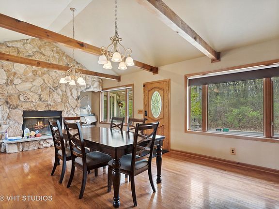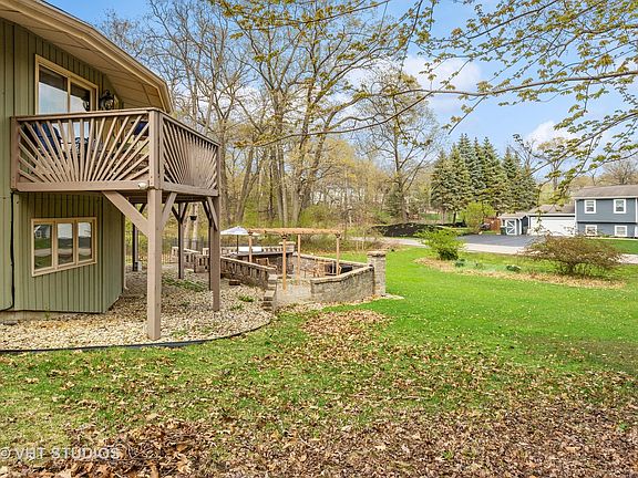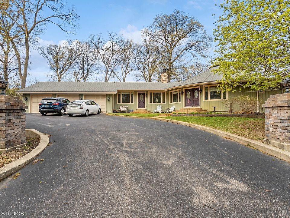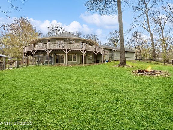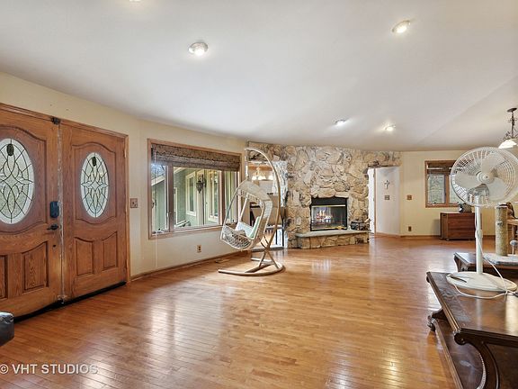 LIST PRICE IS APPROVED! QUICK CLOSE POSSIBLE. One-of-a-kind circular ranch with a finished walk-out basement, providing you with plenty of space and flexibility. The unique circular design offers a striking visual appeal, while the walk-out basement provides additional living space, making it perfect for gatherings and weekend guests. Imagine starting your day with a cup of coffee or winding down with a glass of wine on the wraparound balcony while enjoying the serene view. The balcony not only adds to the home's visual appeal, but it also provides an additional outdoor living space perfect for relaxing and enjoying nature. As you step inside, you will immediately notice the high-end finishes that make this home so special. Hardwood floors, kitchen with granite countertops and stainless steel appliances, and plenty of natural light from every angle. Primary bedroom with dual walk-in closets, bath with shower, sauna (as-is) and dual vanities. Finished recreation room, complete with a bar, bedroom, and half bath, is perfect for hosting guests. Walk out to the brick paver patio with bar, grill, and pergola in the fenced yard. Oversize 3-car garage with epoxy floors allow access to attic storage. The large driveway with side apron offers ample space for parking boats and RVs, making it a perfect home for water sports enthusiasts who want to enjoy warm-weather Fox Lake recreation. Property does need some TLC, sold as-is.