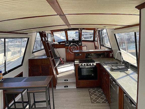 Nicely renovated Floating Loft Style 1982 Bayliner 52 powerboat available for sale near downtown Sausalito few steps away from bus stop, restaurants, ferry terminal, etc.