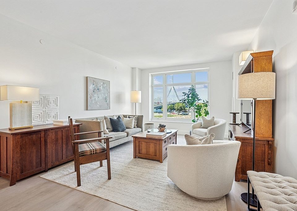 You step off the Harborwalk and into 4J, and the city softens. Floor-to-ceiling glass pulls in the water and the Zakim—front-row, every room. The main living area is built for actual living: a defined dining zone for a seated meal, plus easy island seating when it’s just takeout and a game. The kitchen is organized for real life—an oversized walk-in pantry sized for North End specialties and weekly Star Market runs, with clean, streamlined cabinetry that keeps prep clutter out of sight. The split-bedroom plan respects privacy. The primary suite lands the details that matter—custom closets throughout and an en-suite bath—while the second bedroom and full bath balance the plan for guests, office, or both. Storage is a standout across the home; nothing feels forced or improvised. Lovejoy Wharf completes the picture with full-service amenities: 24/7 concierge, fitness center, resident lounges, roof terrace, and valet parking.