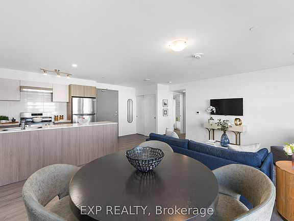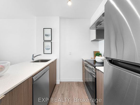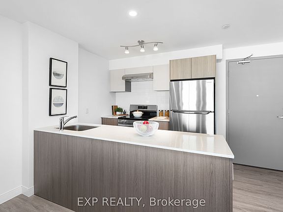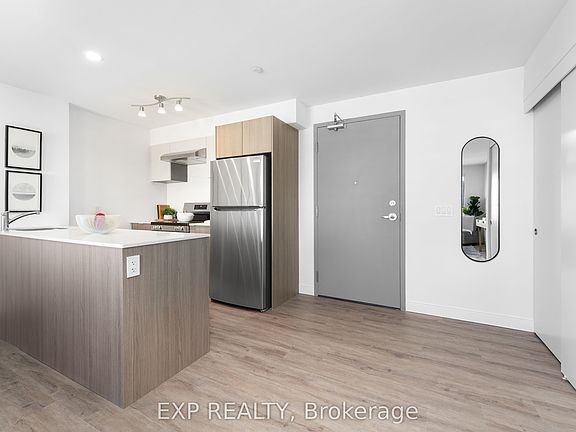 The Lavender at The Manett is a thoughtfully designed 1-bedroom penthouse suite offering 694 square feet of interior living space plus a 113 square foot balcony. Inside, the open-concept layout creates a bright and welcoming atmosphere, with oversized windows that fill the living, dining, and kitchen area with natural light and showcase stunning views of the Niagara Escarpment. Durable vinyl plank flooring ties the space together, while the kitchen features quartz countertops, sleek cabinetry, and stainless steel appliances including a fridge, range, and dishwasher, with a layout that makes cooking or entertaining effortless. The spacious bedroom includes a full-size closet and plenty of room to unwind, while the stylish 4-piece bathroom combines comfort and practicality. In-suite laundry, central air conditioning, and individually controlled heating and cooling ensure year-round comfort. Life at The Manett means more than just a beautiful suite. Residents enjoy access to premium amenities including a modern fitness centre, multipurpose social lounge with kitchen, landscaped courtyard, bicycle storage, underground parking, and attentive on-site property management. With secure key fob access, video surveillance, and visitor parking, convenience and peace of mind come built in. Located steps from Koretz Park and only minutes from grocery stores, schools, restaurants, and Mount Pleasant GO Station, The Lavender offers the perfect blend of penthouse living, modern design, and breathtaking escarpment views.