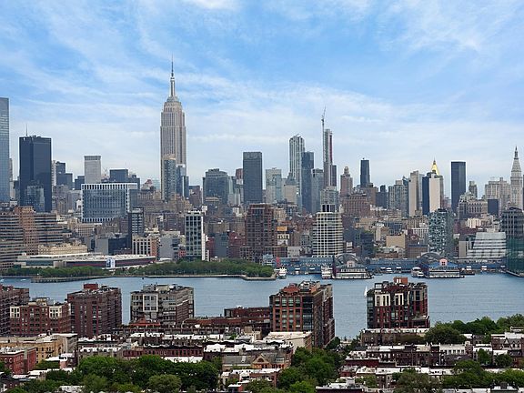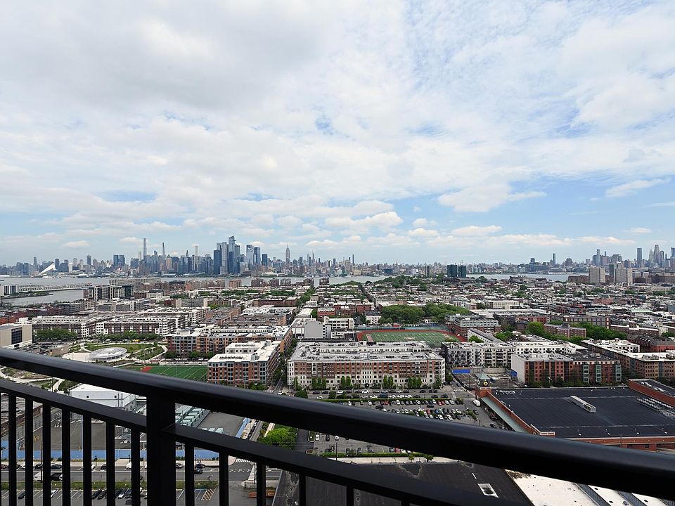 Generous primary bedroom offers direct NYC views, and en-suite bathroom.