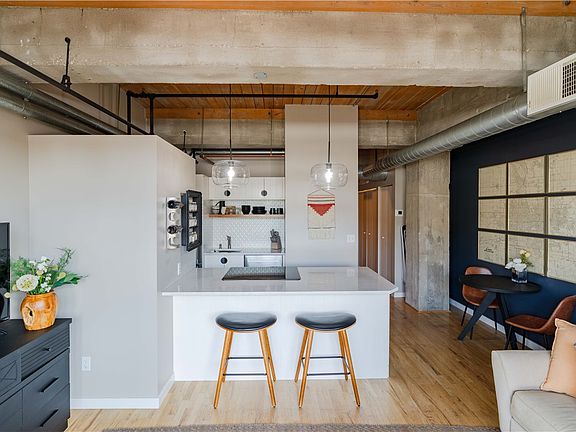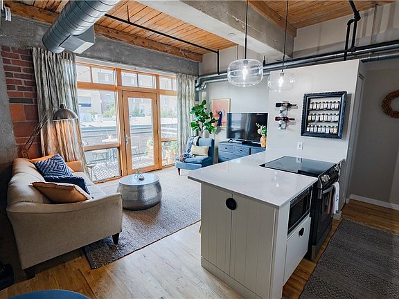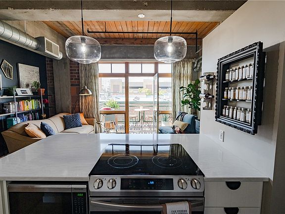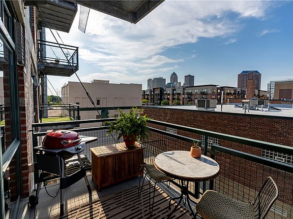 Beautiful Brown Camp Loft 2nd floor unit that has been remodeled with amazing kitchen! Balcony overlooks downtown skyline. Tall ceilings, open floorplan with designer finishes. Kitchen has a pantry closet and breakfast bar. Stackable laundry closet. Bathroom has a bubble soaking tub/shower. One outdoor parking space L32 included which is owned. Building has secured entrance and elevator. Water, internet and basic cable included in HOA dues. Enjoy everything downtown has to offer from Principal Park, farmers market and the bike trail as well as access to the rooftop patio at Brown Camp. All drapes/curtains and wall lights by the bed are reserved.